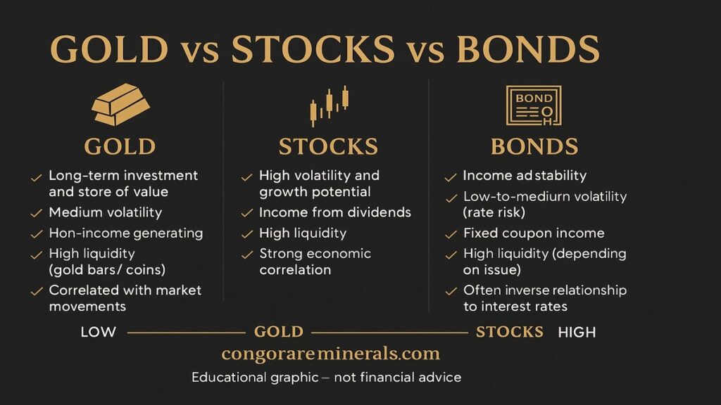 - Want growth with shock protection. Use stocks for compounding, gold for diversification and crisis defense, bonds for income and stability.
