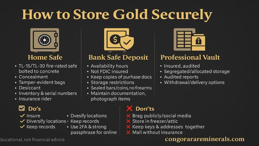 - Keep 1–3 oz coins or a 100 g bar for emergencies while the bulk sits off-site.