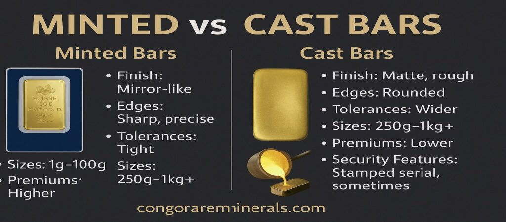 Why it matters: lower processing and finishing costs mean lower premiums. Cast bars are the standard for 250 g to 1 kg and institutional trades.