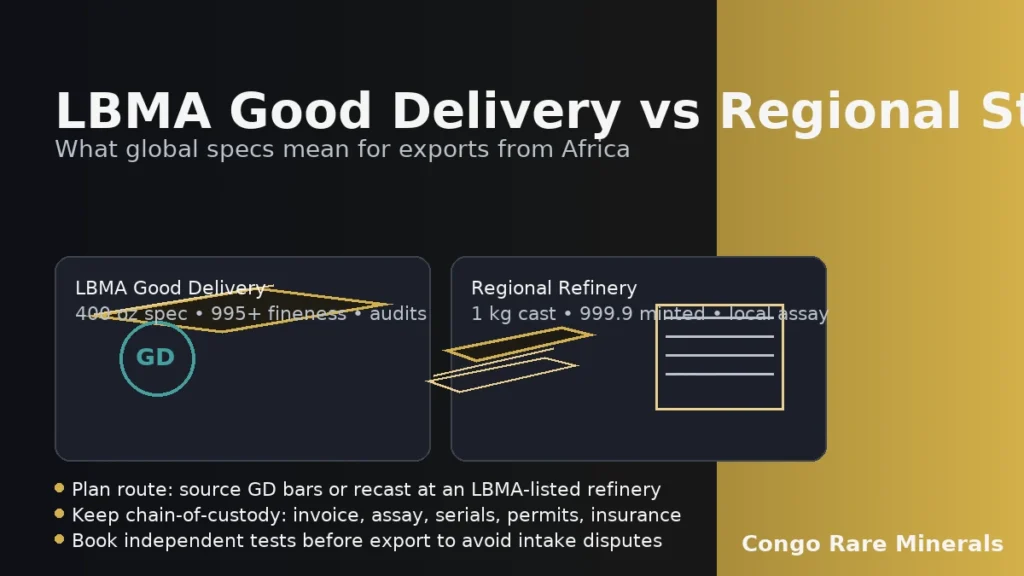 If you expect your gold to move across borders and fetch tight bids, the standard on the bar matters. The global reference is LBMA Good Delivery. Many African refineries operate to strong local standards, but not all are on the LBMA list. Here is what that means for exports, pricing, and paperwork.